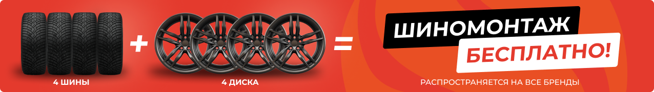 Акция действует при покупке полного комплекта (4 шины + 4 диска). Предложение распространяется на все бренды.